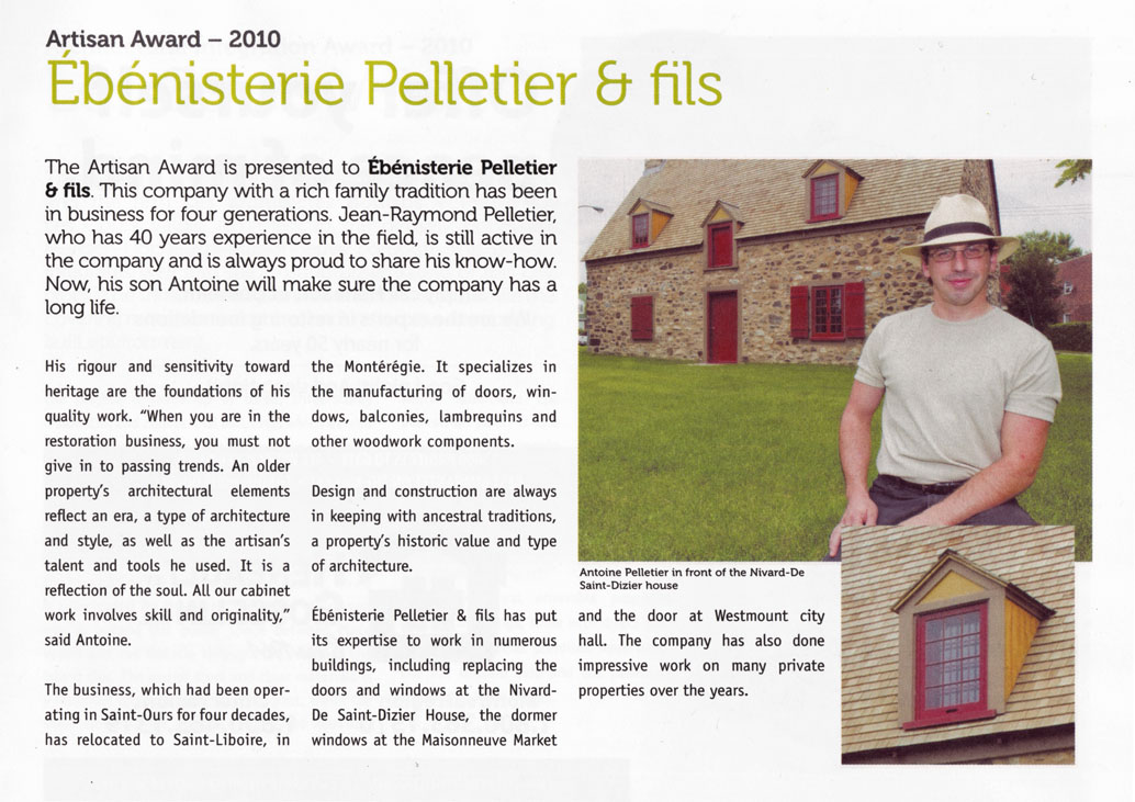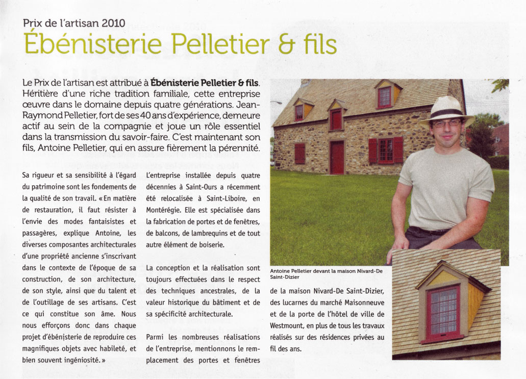 ![]() Prix de l'artisan 2010Le 24 septembre 2010, l'Opération patrimoine architectural de Montréal (OPAM) décernait à l'Ébénisterie Pelletier et Fils le Prix de l'artisan 2010. Ce prix « honore une entreprise s'étant illustrée dans la rénovation d'éléments patrimoniaux » (Le Devoir, 25 septembre 2010). « L'Opération patrimoine architectural de Montréal (OPAM) fête ses 20 chandelles cette année. Dans la foulée de cet événement créé en 1991, destiné à mettre en valeur l'architecture et le patrimoine bâti montréalais, le maire de Montréal, Gérald Tremblay, a remis hier quelque 35 prix émérites à des individus et des entreprises passionnés d'architecture. » (Le Devoir). À l'occasion de cette remise de prix, un cahier spécial de l'OPAM a été publié dans La Presse et The Gazette. On peut y lire : « Héritière d’une riche tradition familiale, cette entreprise oeuvre dans le domaine depuis quatre générations. Jean-Raymond Pelletier, fort de ses 40 ans d’expérience, demeure actif au sein de la compagnie et joue un rôle essentiel dans la transmission du savoir-faire. C’est maintenant son fils, Antoine Pelletier, qui en assure fièrement la pérennité. Sa rigueur et sa sensibilité à l’égard du patrimoine sont les fondements de la qualité de son travail. » Veuillez lire les articles tels que publiés pour plus d'informations : Nous tenons à remercier sincèrement tous nos partenaires d'affaires, sans qui nos projets ne pourraient être réalisés. LiensLe Devoir - L'Opération patrimoine architectural de Montréal fête ses 20 ans |